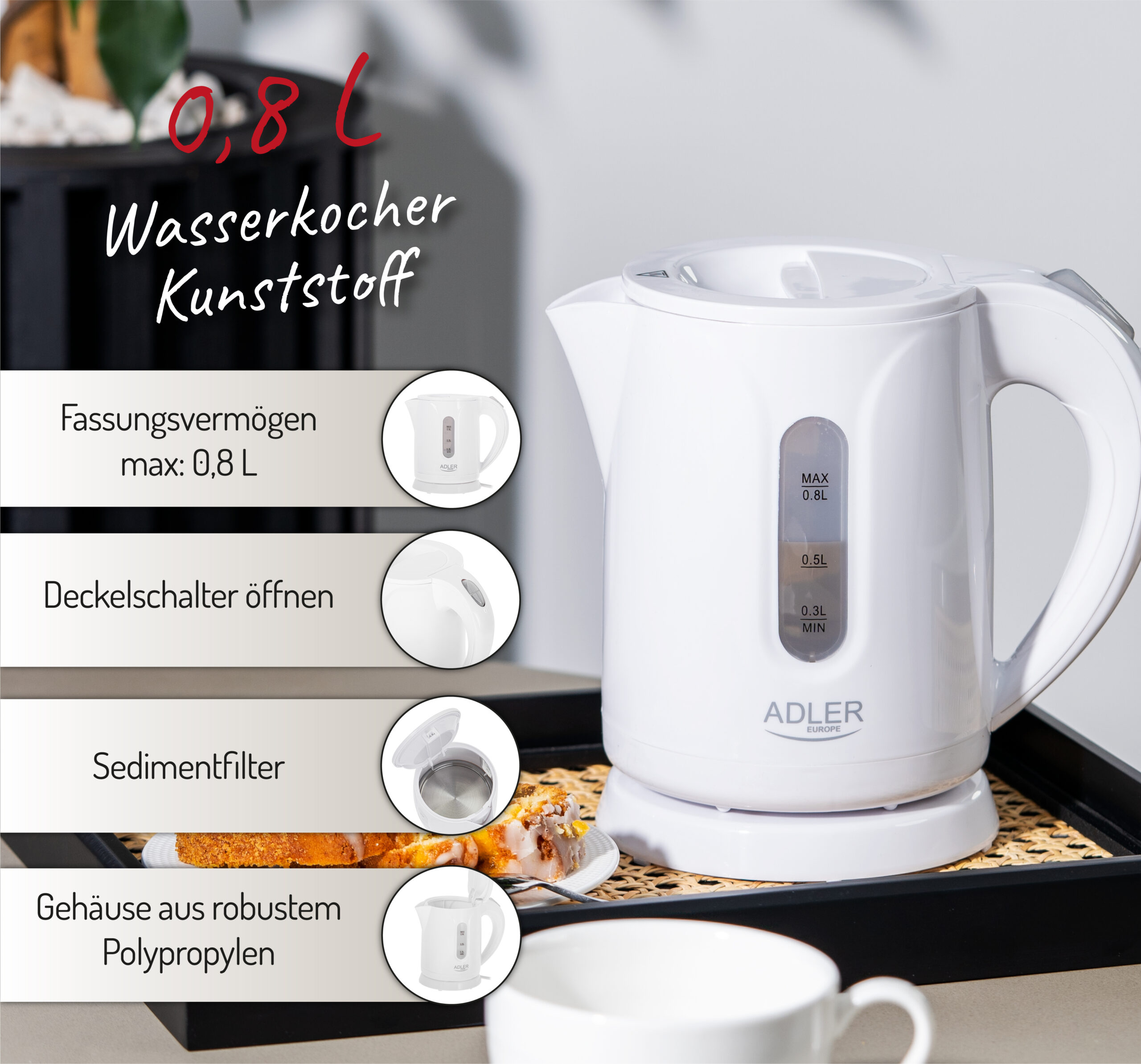 Fassungsvermögen 0,8 L | Leistung 850W | Verdecktes Heizelement | Abschaltautomatik | Trockengehschutz | Kompakte Grundplatte mit Kabelaufbewahrung | Drehsockel 360 Grad | Modernes, ergonomisches Design | EAN: 5903887809207 | Verpackungseinheit: 12Stk.
