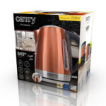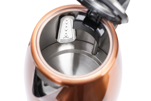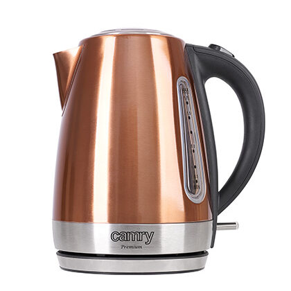 Fassungsvermögen: 1,7L | Leistung: 2200 W | Schirmgehäuse aus Edelstahl in Kupfer | Automatische Abschaltung | Schutz gegen Einschalten eines leeren Wasserkochers | 360-Grad-Drehsockel | LED-Kontrollleuchte | Flacher Boden (Heizung in der Bodenplatte) | EAN: 5902934830904