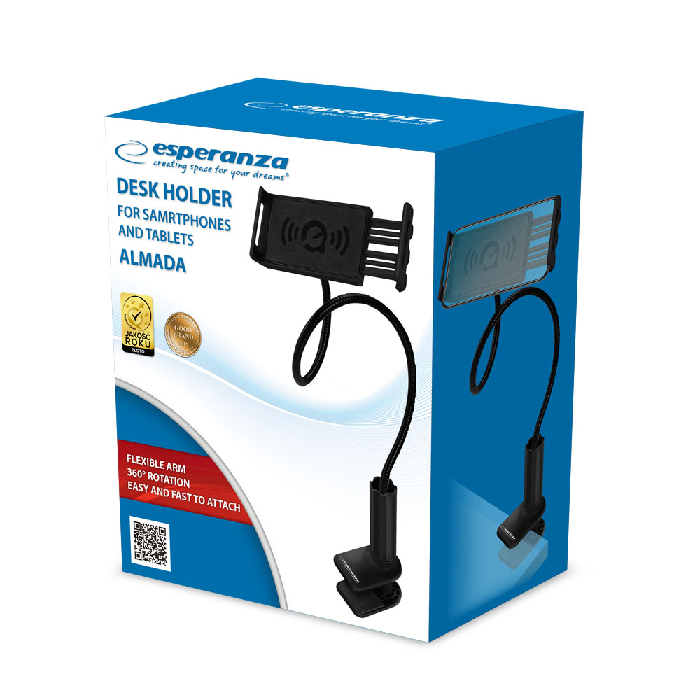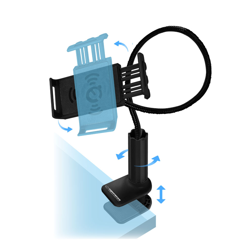 Ein solider Schreibtischhalter für Telefone und Tablets. Lässt sich sehr einfach überall an einer Schreibtischplatte, einem Regal, einer Schrankwand oder einem Bettkopfteil befestigen. Die Klemme, mit der der Halter am Schreibtisch befestigt wird, ist mit einer weichen Unterlage ausgekleidet, die eine Beschädigung der Schreibtischoberfläche verhindert. Mit dem flexiblen Arm und der um 360° drehbaren Klemme können Sie Ihr Tablet oder Smartphone in jeder beliebigen Position platzieren. Die Klemmen der Halterung sind mit einer weichen Beschichtung versehen, die verhindert, dass das Telefon oder Tablet zerkratzt wird. In der Halterung können Geräte mit einer Breite von 115÷175 mm angebracht werden. Perfekt zum Arbeiten, Ansehen von Filmen oder für andere Einsätze mit einem Tablet oder Telefon.