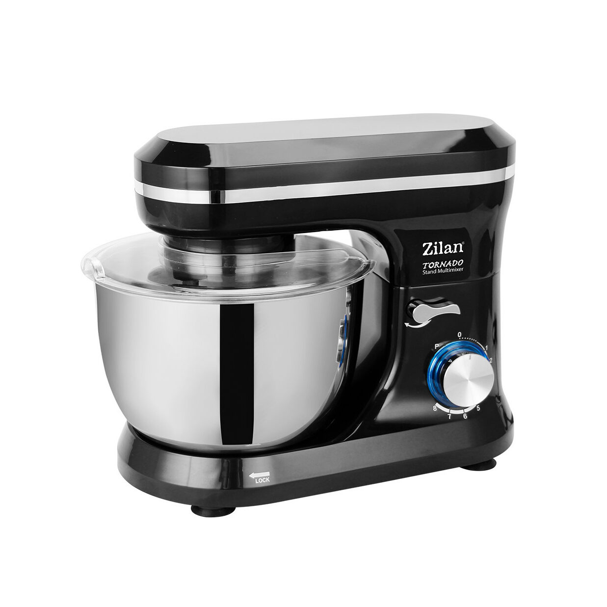 ABS-Kunststoffgehäuse | 4,5 lt Edelstahlschüssel | Stufenloser Drehschalter mit 6 Stufen + Pulsfunktion | LED-Licht für Blinker | Hubwerk mit Sicherheitsschalter | Planetenmischer | Leistung: 1000 Watt